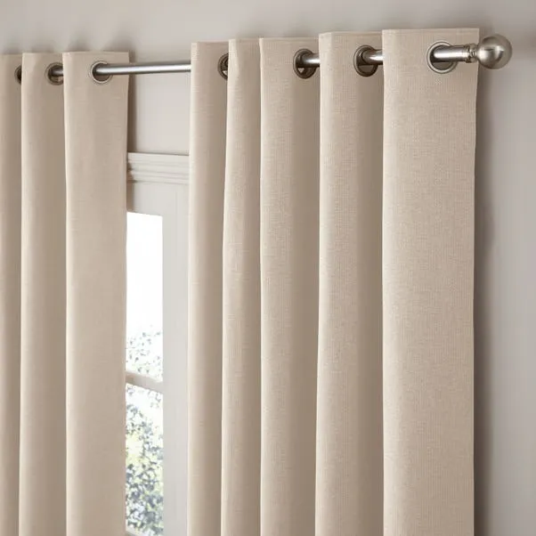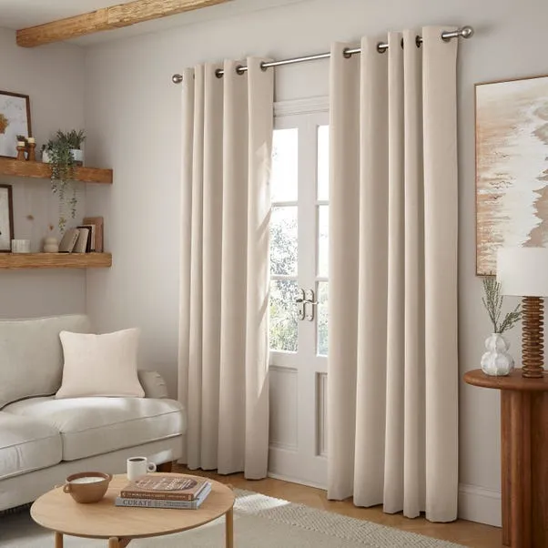 Beige eyelet living room curtains designed with a smooth and modern finish, offering excellent light control and privacy while adding a clean and elegant touch that suits windows and glass doors in contemporary UAE homes.