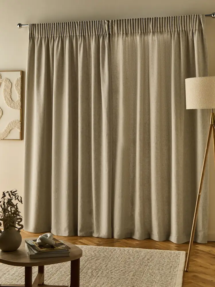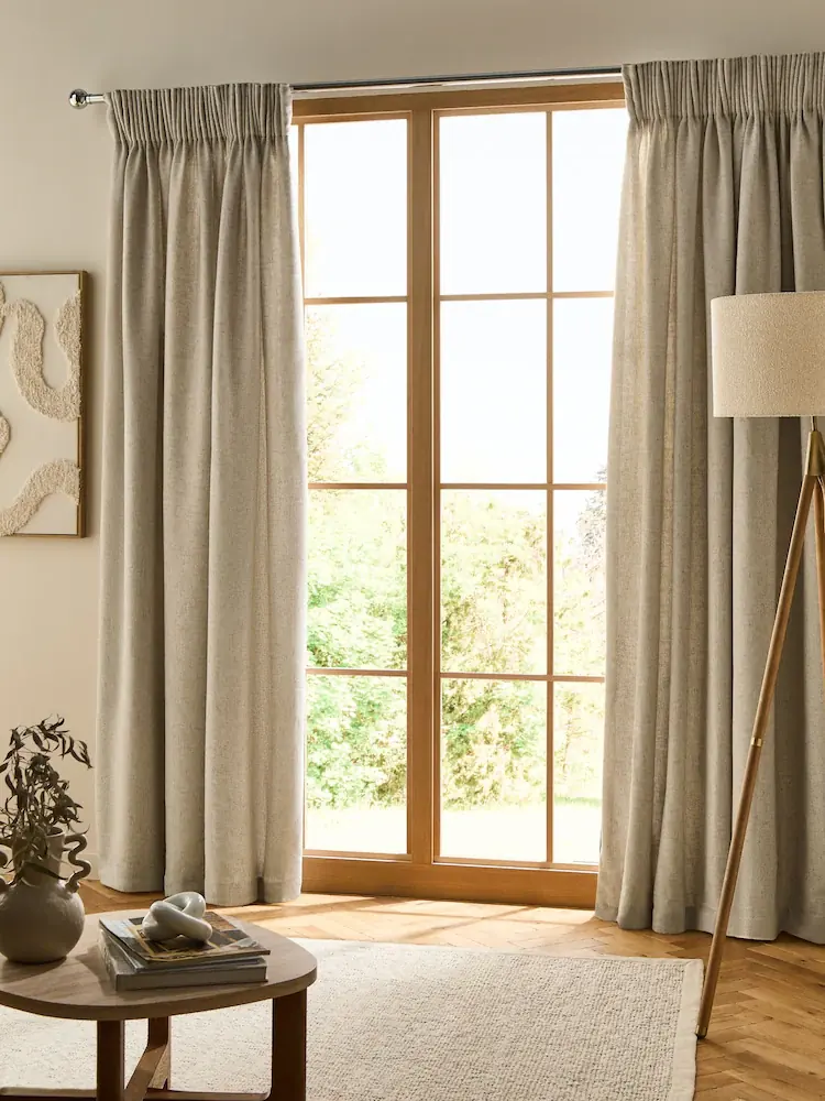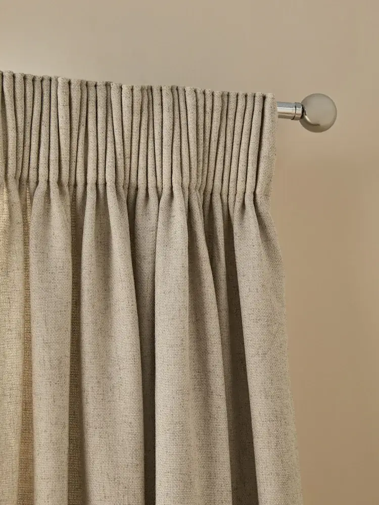 Add a soft and elegant touch to your space with these beige pinch pleat linen curtains designed to gently filter sunlight while enhancing privacy. The natural weave fabric offers breathable comfort and a smooth drape, making them ideal for UAE living rooms, bedrooms, and window or door settings with a modern timeless look.