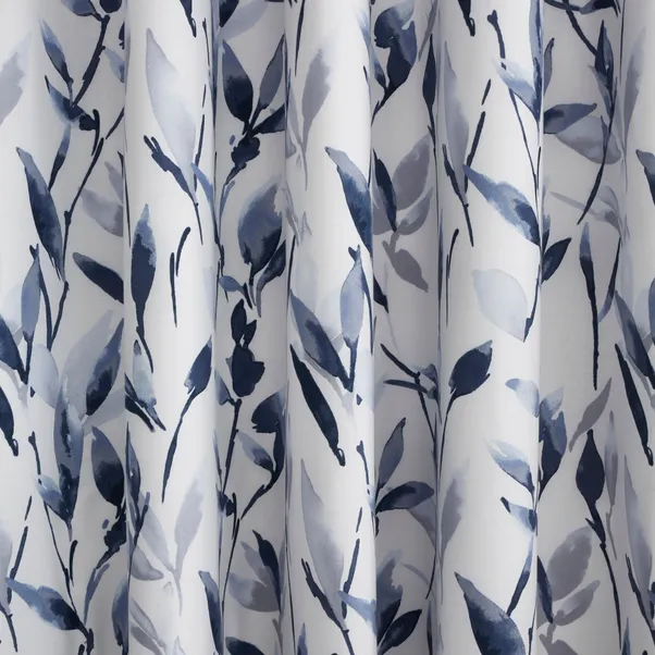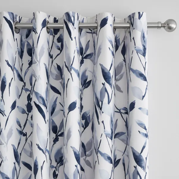 Blue leaf print blackout curtain designed to block sunlight, reduce heat, and enhance privacy. Ideal for living rooms and bedrooms, these curtains feature a modern botanical pattern in blue tones on thick blackout fabric with an eyelet ring top for easy hanging and a fresh, contemporary interior look.