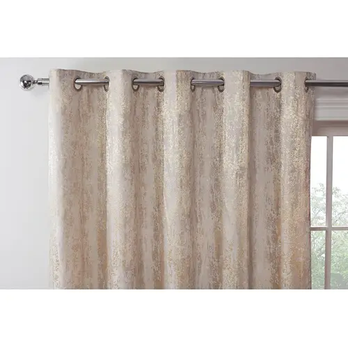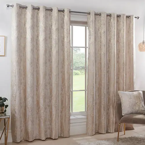 Add glamour to your home with Champagne Jacquard Eyelet Curtains. Featuring a subtle embossed texture and metallic shimmer, these polyester curtains in cream offer elegant draping and a statement look, perfect for enhancing bedrooms with style and sophistication.