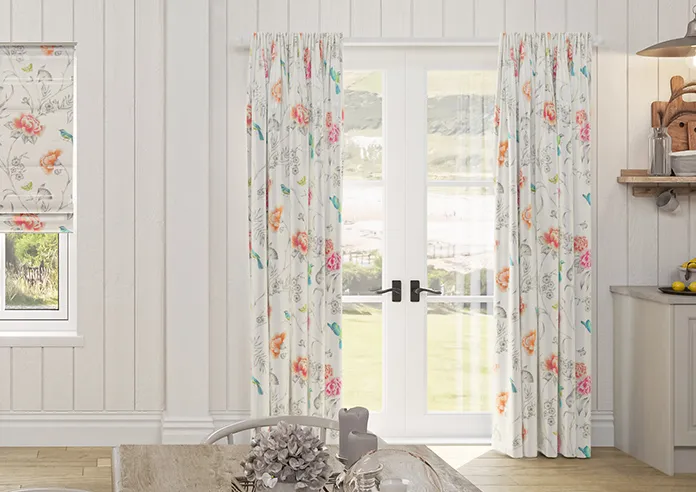 This floral silk curtain features a soft pastel print with elegant birds and flowers, adding a fresh and airy feel to your space while gently filtering light and enhancing privacy, ideal for living rooms and bedrooms in UAE homes.