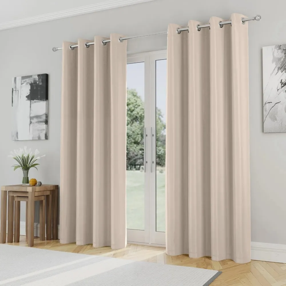 Enhance your room with the Natural Beige Eyelet Blackout Curtain. Its smooth, velvety finish adds a soft elegance while blocking out sunlight for better comfort and privacy. Designed with metallic eyelets for easy sliding and a clean, modern look, it fits perfectly in UAE bedrooms, living rooms, and apartments.