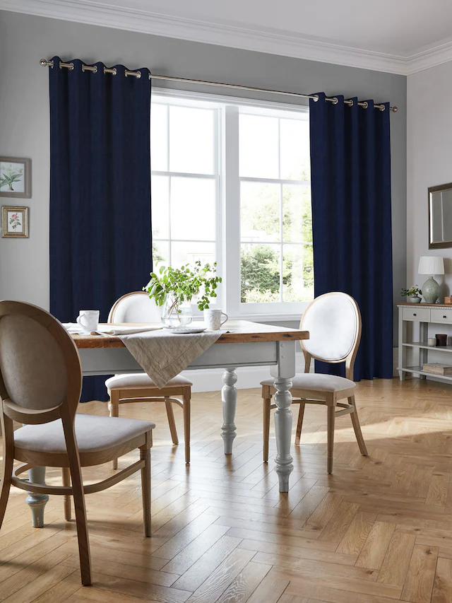 Make a bold and elegant statement with these royal blue eyelet linen curtains designed to enhance privacy while softly controlling natural light. The rich textured fabric drapes beautifully, making them perfect for UAE dining rooms, living areas, and bedrooms. Durable metal eyelets ensure smooth sliding with a clean and modern finish.